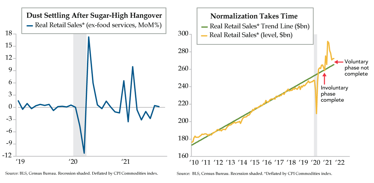 The involuntary phase began with last spring’s shutdowns and ended after the subsequent reopening in December 2020 when the yellow line fell back to the green line. The second voluntary phase started after fiscal stimulus was pumped into the household sector in January and again in March, blowing a massive sugar-high spending bubble through the end of 2021’s first quarter. The second-quarter fallback and modest showing to end the third quarter still leave the level of real retail sales 2.7% above trend.