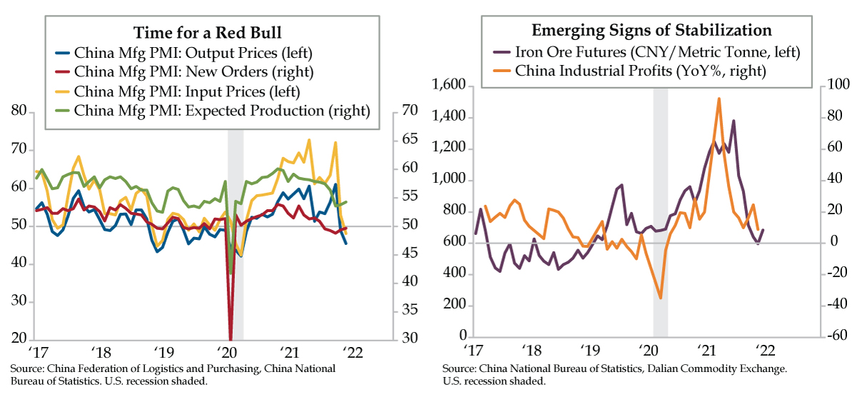 At 54.3, Expected Production (green line), a pent-up demand proxy, is below its post-pandemic average of 57.7, but equally comfortably in expansion. “Middling” is an apt term to describe how China’s factory sector is kicking off 2022, and that’s likely as Xi Jinping wishes it to be as he turns his focus to bolstering the domestic, but not international, economy.