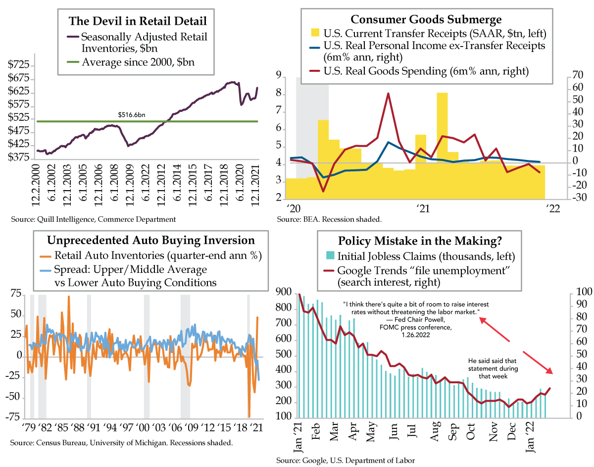 - Despite December’s record 4.4% YoY build in retail inventories, they still remain 3.2% off of October 2019’s record high of $665 billion; meanwhile, at a -7.7% 6-month annualized rate in December, inflation-adjusted Goods Spending is now at its lowest levels since April 2020