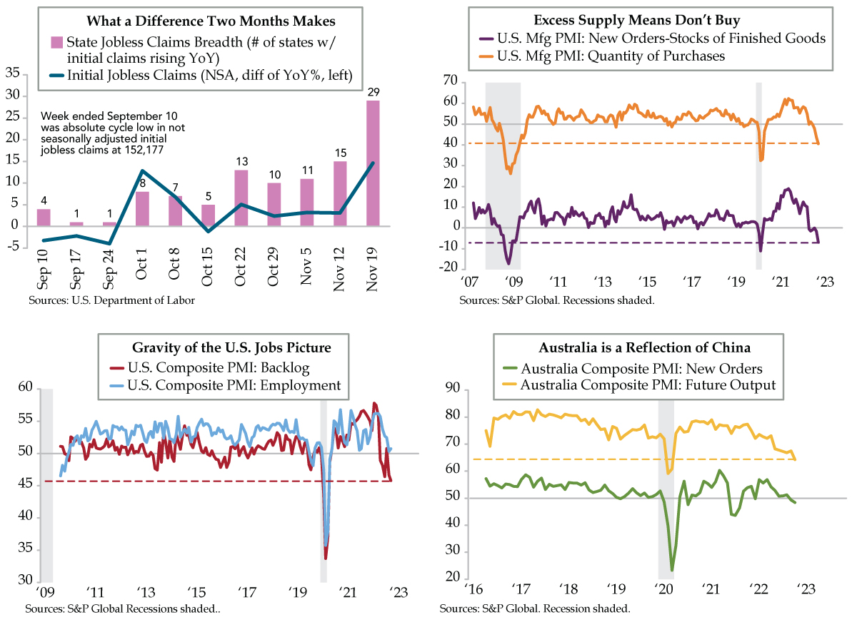 Validations are multiplying. The headline S&P Global Composite (economywide) Purchasing Managers Index for the U.S. for November all but shocked the macroeconomics community Wednesday morning, printing at 46.2 vs. estimates of 48.0. This marked a fifth straight month of weakening and the second-lowest level since the pandemic first hit. More worrisome is the persistent decline in Backlogs, which peaked at 57.8 in March and have since slumped to 45.8, a deeply recessionary read (red line). Pent-up demand has segued to destroyed demand which will translate to the employment index’s imminent turn to negative territory (light blue line).