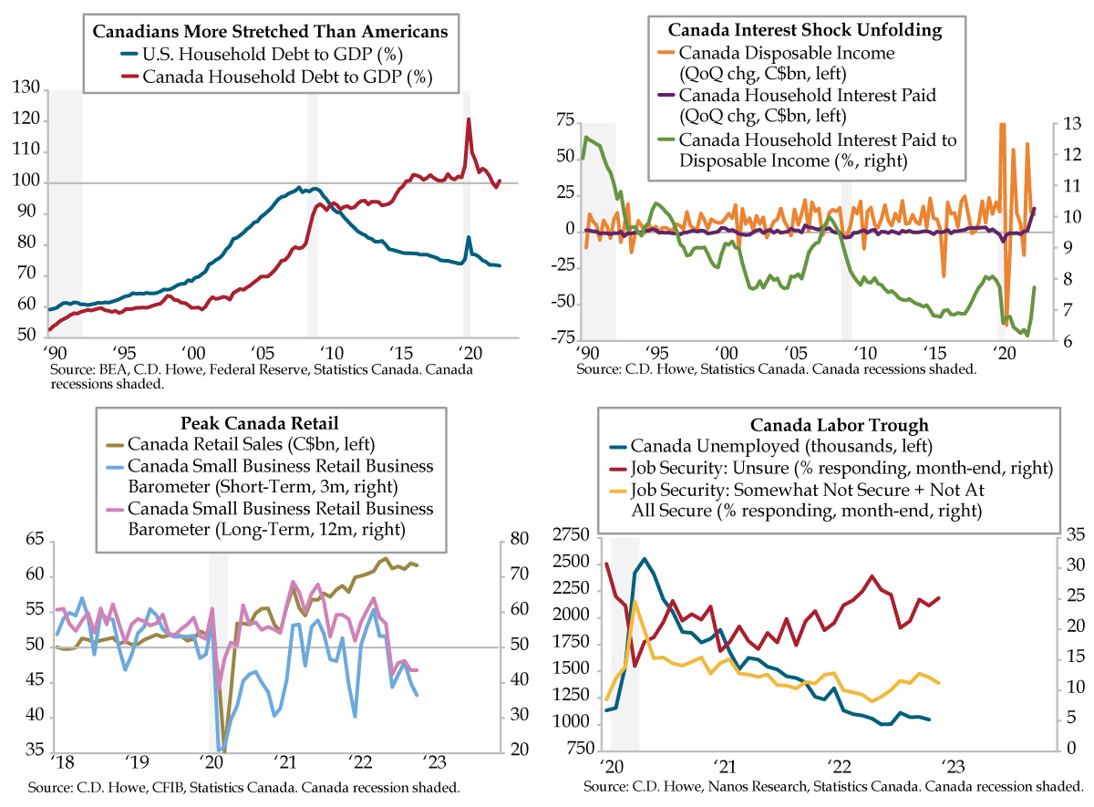 This month, 65% of Canadian economists surveyed by Bloomberg predict recession, up from 45% in November. The turn in the labor market would up the probability further. As was the case with Retail Sales, the number of unemployed stopped falling in June (blue line). In addition, the Nanos consumer confidence report reported a May trough for negative responses on job security (somewhat not secure plus not secure at all, yellow line). Uncertainty about job security also has picked up from August’s interim low of 20.2% to 25.1% thus far in December (red line). It’s safe to say that a loss of income coupled with a mortgage reset would be enough to break already-stretched Canadian households.