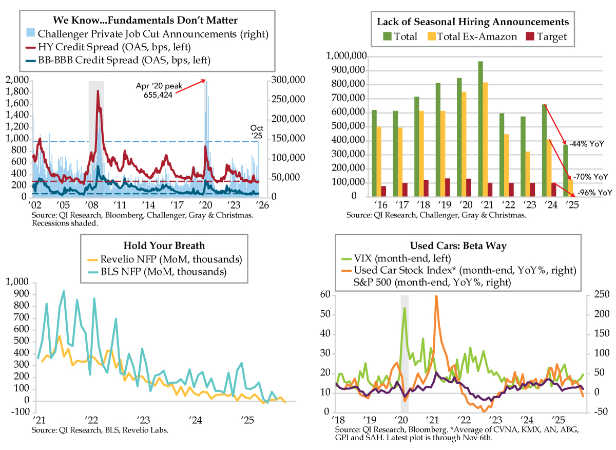 Z-scoring Challenger’s October private figure landed it squarely at a +2.0. High Yield (HY) corporate credit is historically sensitive to economic conditions, but Challenger’s data failed to catalyze dislocation. At 281 basis points (bps), the HY spread registered a -0.9 z-score (red line) and the BB-BBB ‘Mason-Dixon’ line between investment grade and junk was 73 basis points, or a -1.1 z-score (blue line). Fundamentals appear to not matter.