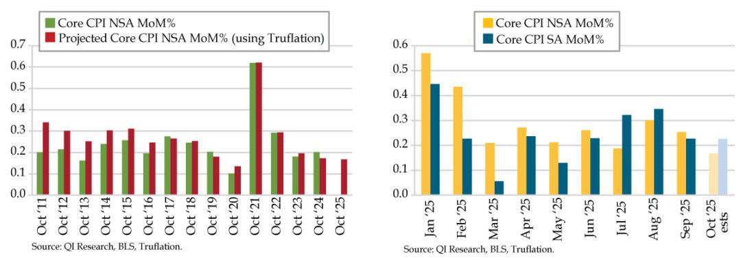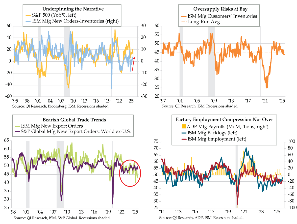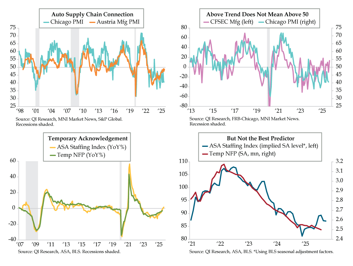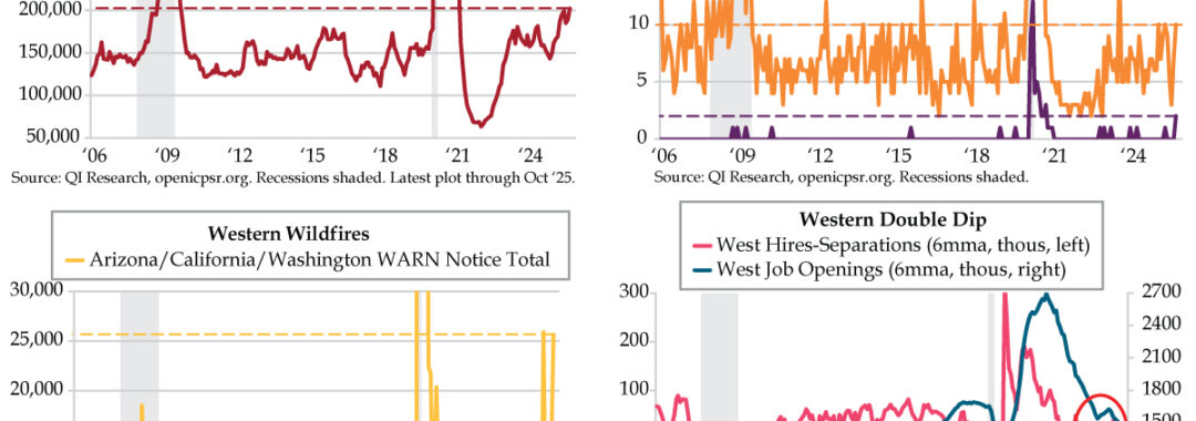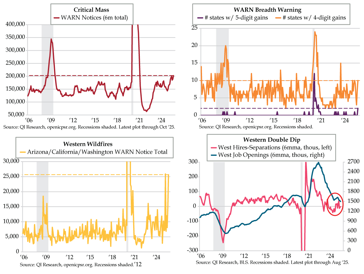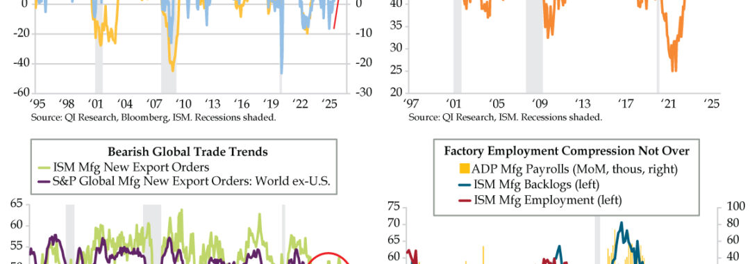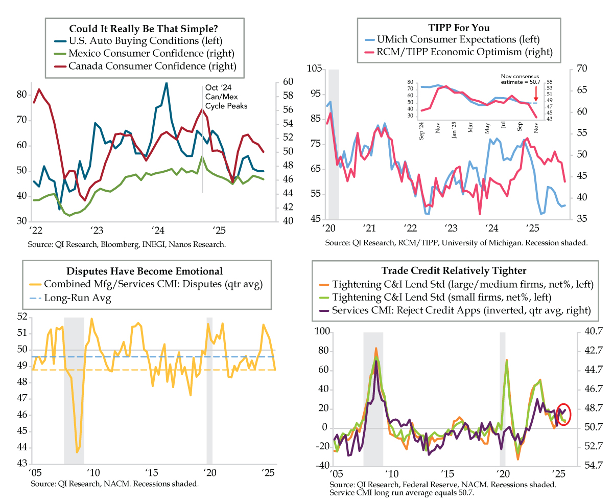 Squint at the top right chart’s inset and you’ll notice that RCM/TIPP and UMich are back into realignment. The former points to the distinct possibility of a large downside disappointment come Friday’s UMich November preliminary report, which the consensus (50.5, up slightly from October’s 50.3) is not discounting. Diving deeper, RCM/TIPP continued to ease off August’s near-record high of 65.1, posting a third straight decline through November’s 58.6. Non-investor confidence collapsed to 38.0 in November, a level consistent with the post-pandemic inflationary period of 2022-24, the summer 2011 euro crisis and the 2007-09 recession.