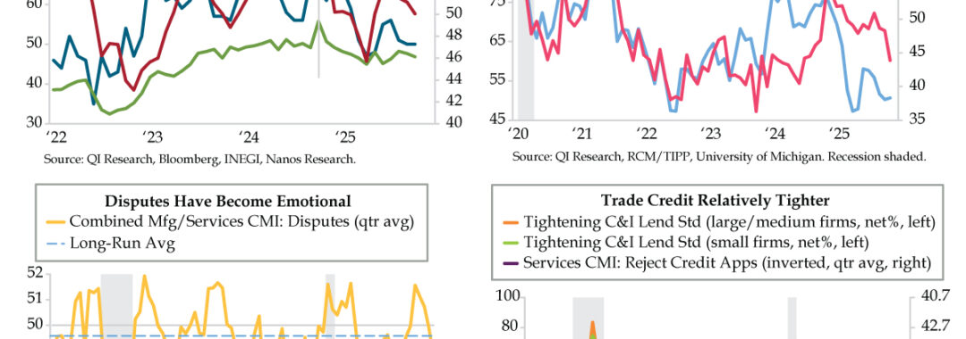 Through a different prism, yesterday’s RCM/TIPP Economic Optimism Index updated us on U.S. confidence – and it wasn’t pretty. For context, it rose to an interim high of 54.0 in December 2024. November’s RCM/TIPP number fell 9.1% month-over-month to 43.9 from the prior month’s 48.3 (fuchsia line). As background, the 25-year-old RCM/TIPP figure prides itself as a harbinger for forward-looking consumer expectations and reliably guided the University of Michigan (light blue line). The two series were mirror images from 2020 to 2022 before disconnecting in 2023 and 2024.