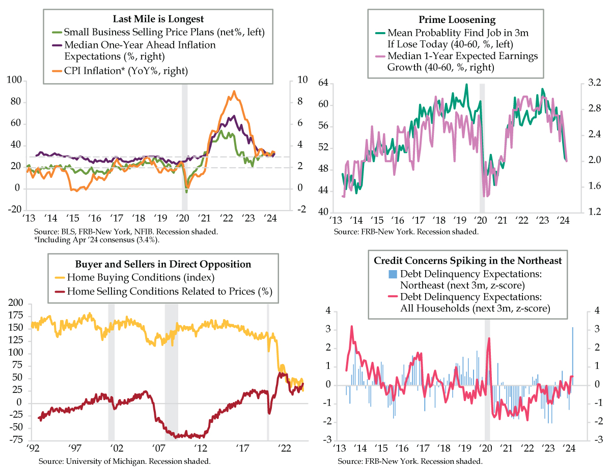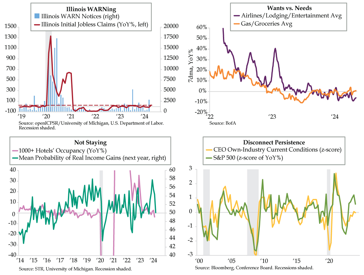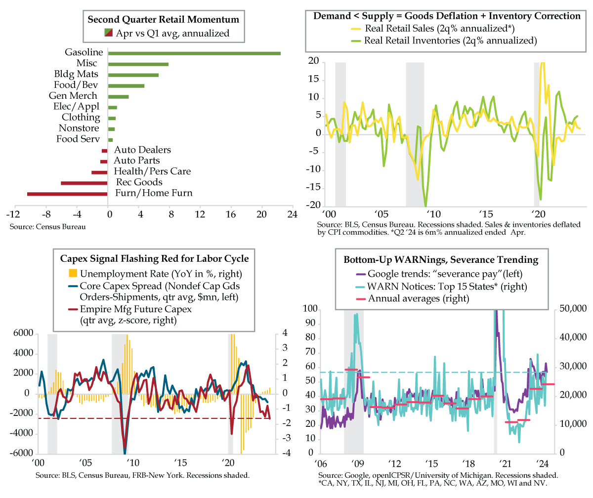 - In April, only 49% of households surveyed by Gallup saw now as a good time to find a quality job, the first sub-50 reading in eight years; given the series has historically moved with worker average hourly earnings growth, additional wage disinflation appears in store
