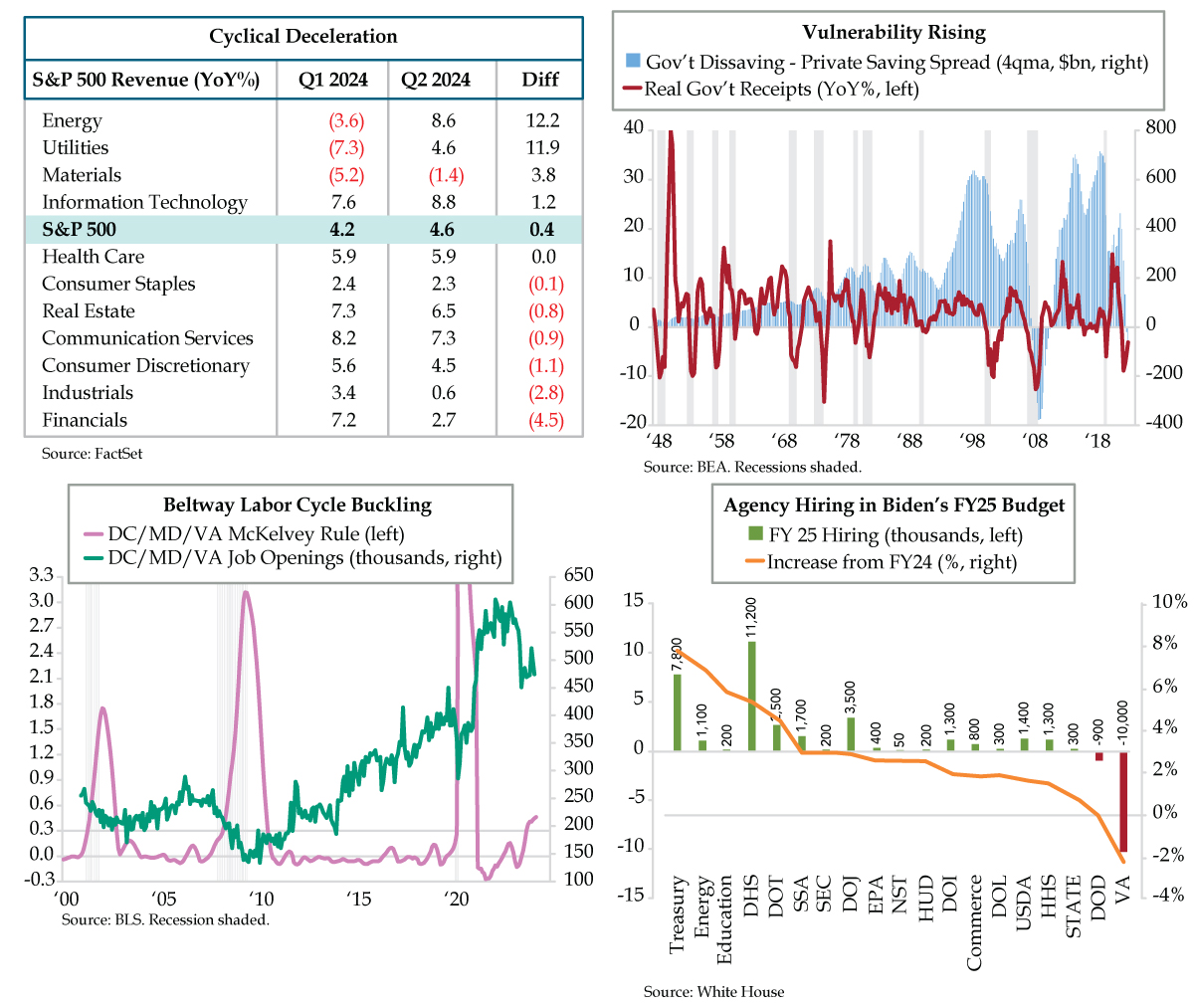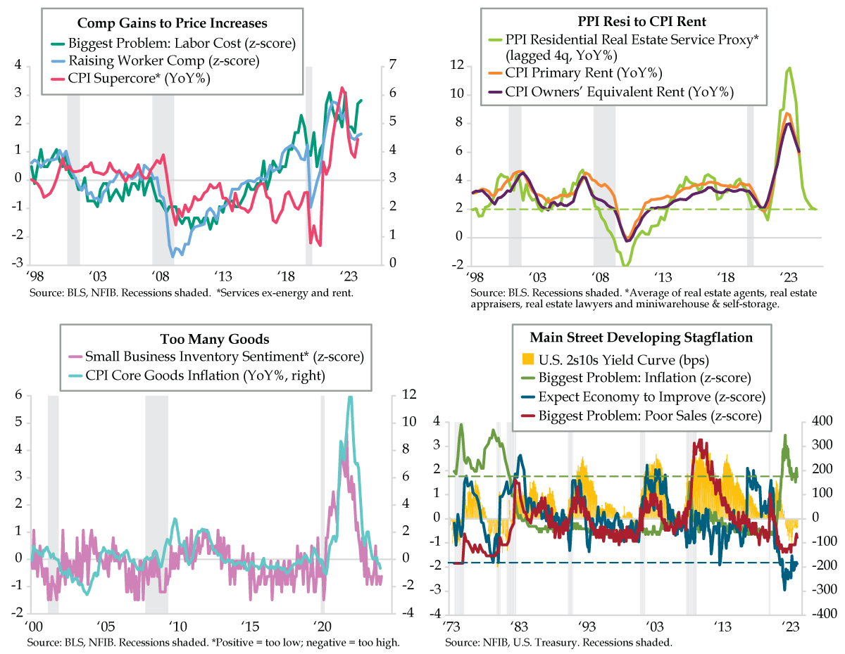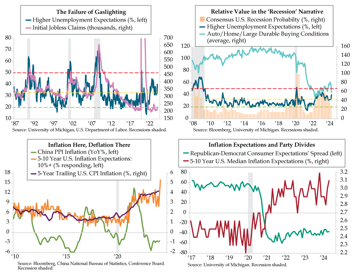 - In April, only 49% of households surveyed by Gallup saw now as a good time to find a quality job, the first sub-50 reading in eight years; given the series has historically moved with worker average hourly earnings growth, additional wage disinflation appears in store