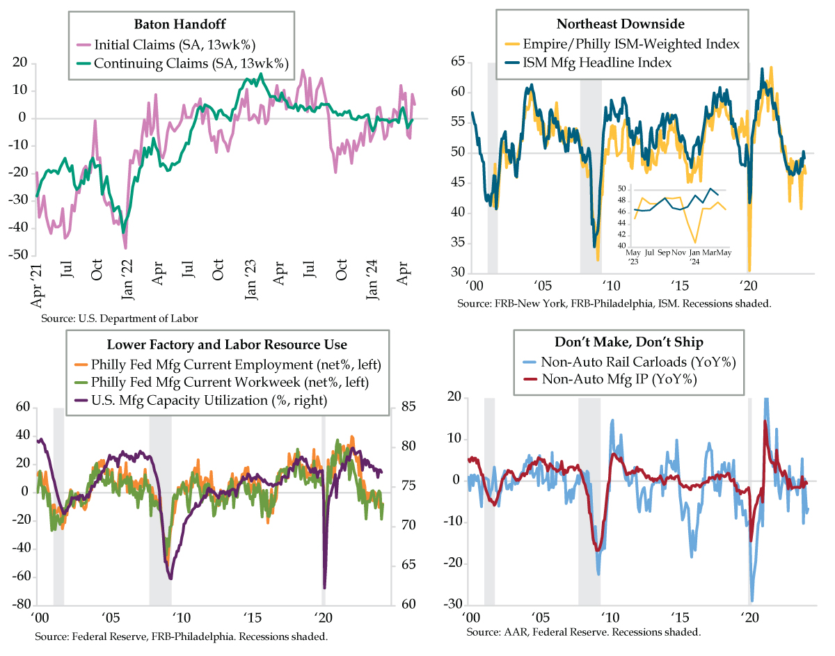 - Overall Indeed job postings have not risen MoM since 2021, and 40 of 47 job categories have posted MoM declines thus far in May; similarly, Lightcast job postings requiring Minimal Education have nosedived to -17.6% vs. pre-COVID levels, a red flag for initial claims