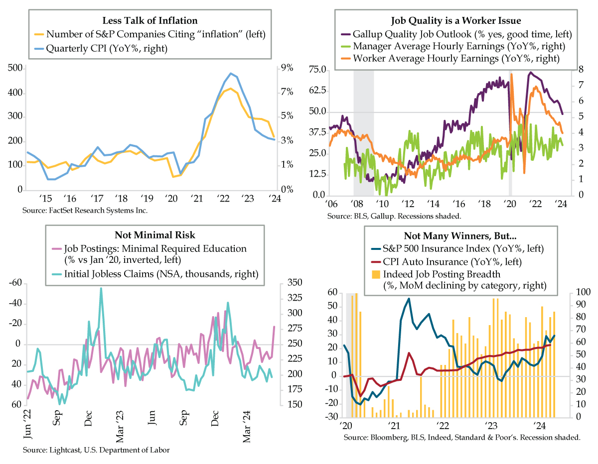 - Per FactSet, 219 S&P 500 companies have cited “inflation” in their Q1 earnings calls, the lowest since Q1 2021’s 218 and seventh straight QoQ decline; despite the downward trend, a record 41% of households, per Gallup, cited inflation as their top financial problem in 2024