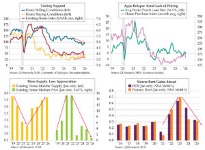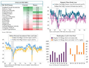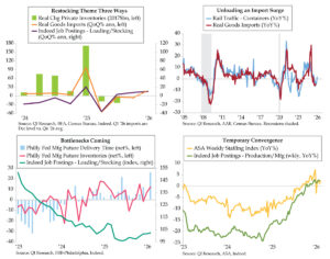 The transitory tightening in the industrial supply chain is colliding with the long arm of a loosening in the labor cycle. Indeed’s Wage growth tracker fell to a 2.0% rate in January (red line), a smidge above the 2020 low point. Indeed’s grind lower suggests there will be more easing in wage pressures via the official average hourly earnings trends for all employees and workers (green and dark blue lines). Because the restock in manufacturing activity is generating some heat, the cooling in wage trends likely is more a broader service sector story. All told, Indeed’s guidance points to the potential for a downside surprise in wages come Employment Friday.
