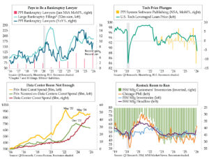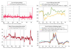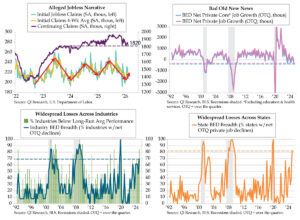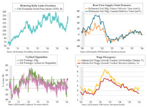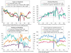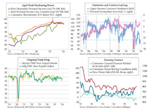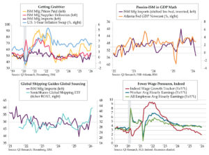 Over time, the ISM Imports index has become a more relevant directional beacon recently. Since the 2011 inception of the Atlanta Fed gauge, rolling 12-month correlations between ISM Imports and Atlanta Fed GDP have never been more inversely correlated than over the last 12 months, running in the vicinity of -.70. The second quad chart depicts the ISM series shifted one month forward to be aligned with the concurrent news flow and subsequent model adjustments. The latest 3.0% figure (orange line) overstates the growth situation that the inverted Import index implies. Therein lies the risk from the next round of official trade statistics.