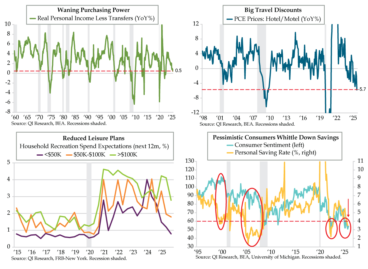 Recession probability to rise into 2025’s second half as private demand underperforms. The tariff shock should generate greater risks for a downshift in business investment and a more challenging environment for consumer cyclicals vis-à-vis consumer non-branded noncyclicals.