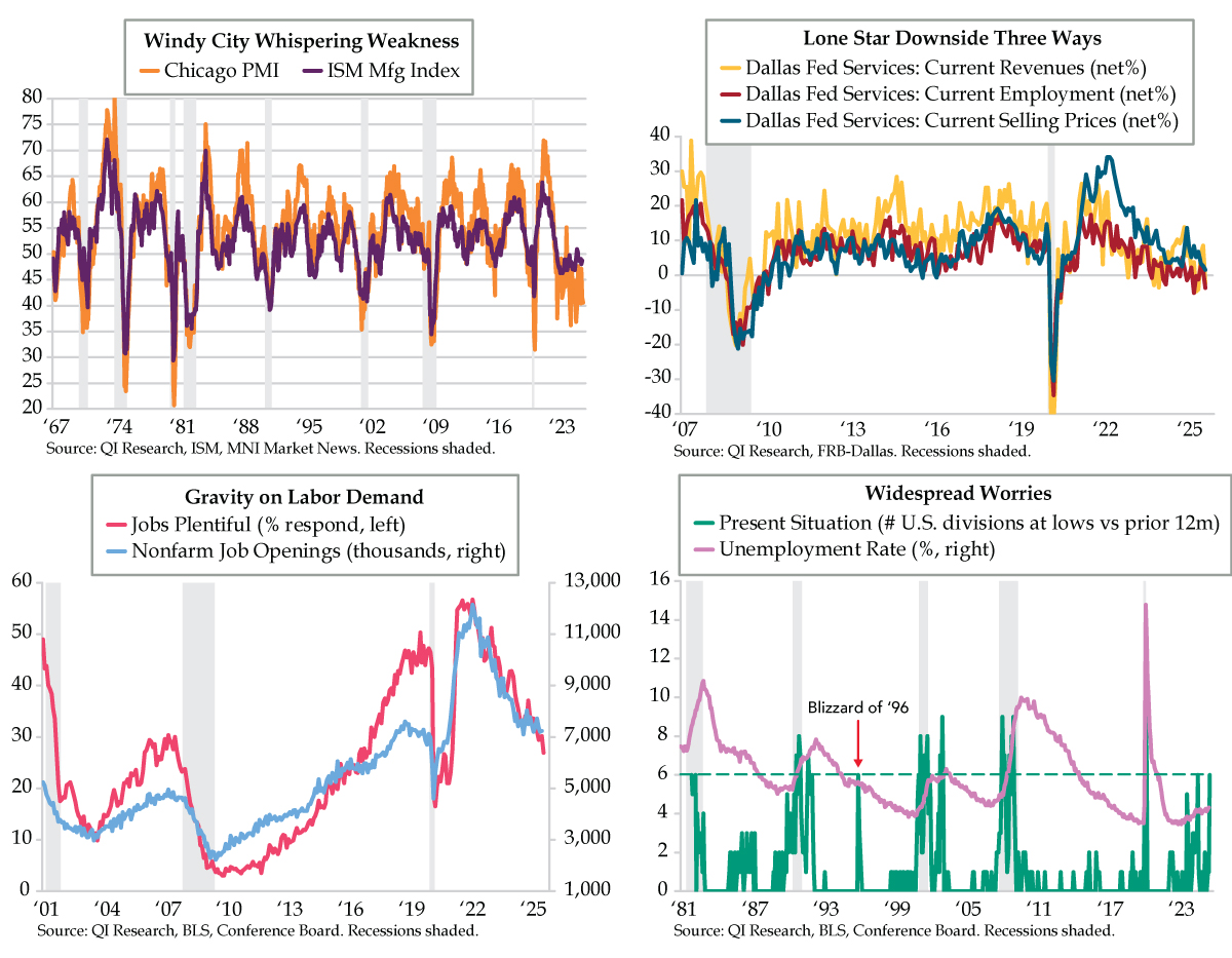 QUICK QUILL — The Chicago PMI is flagging a larger-than-expected drop in today’s ISM relative to consensus. And weakness in Dallas Fed Services has amplified downside risk for growth, labor and inflation. Consumer Confidence revealed that…